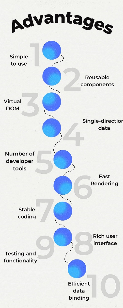 React development is perfect for programmers because of its virtual DOM functionality. Virtual DOm is the JS object in the React technology. It is the only copy of the original DOM, which is stored in the memory and synchronizes with the React DOM library. It gives various benefits like less strain on memory usage, improved performance and high productivity.