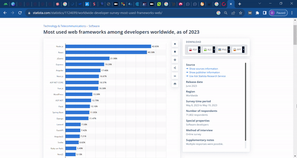 By 2023, Node.js had overtaken React.js as the most widely used web framework among programmers worldwide. Node.js and React.js are used by 42.7 percent and 40.6 percent of respondents, respectively, to the survey.