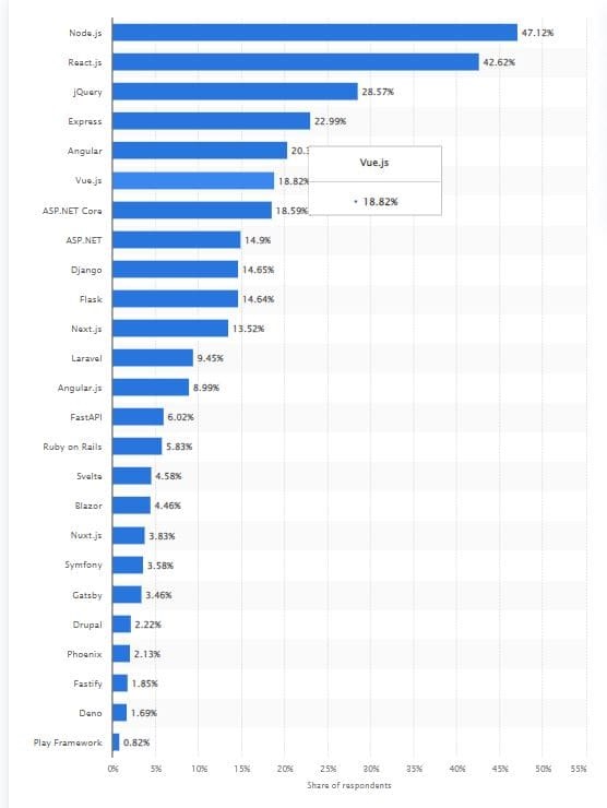 Node.js will overtake React.js to become the most used framework among software developers worldwide as of 2022. As per the research, 47.12 % of the respondents use Node.js, while 42.62% utilize React.js.