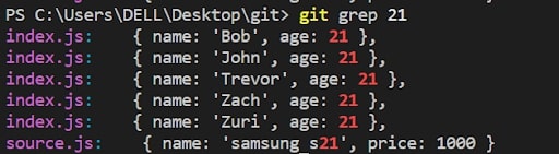 Using the command ‘git grep’ you can search for any string in the repository. As it will return the source file where the matching data resides and the content that matched.