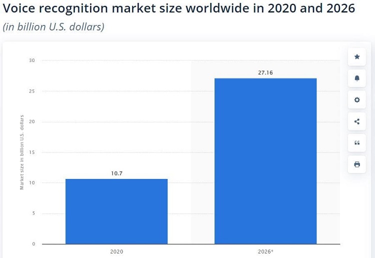 Also, the market size was forecasted by global voice recognition to increase from 10.7 billion U.S. dollars in 2020 to 27.16 billion dollars by the end of 2026. Therefore, the estimated CAGR from 2021 to 2026 rises to 16.8 per cent.